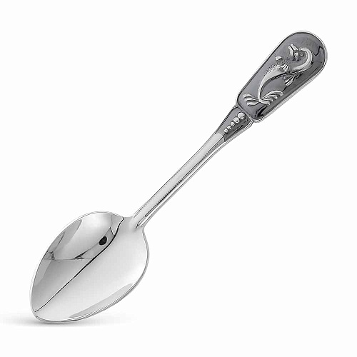 Красивая детская ложечка выполнена из высококачественного серебра 925ׄ°. В верхней части оксидированного черенка изображен дельфин. Поверхность ложки отполирована вручную, что придает изделиям невероятный блеск. Серебряная чайная ложка «Дельфин» - изумительный подарок ребенку.