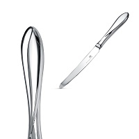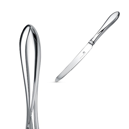 Идеально гладкий нож с отполированной поверхностью и плавно закругленным лаконичным лезвием. Ручка ножа выполнена из серебра 925°. Лезвие изготовлено из высокопрочной нержавеющей стали.