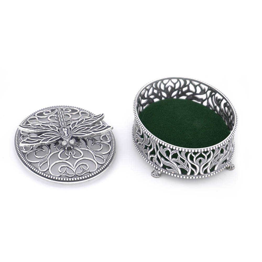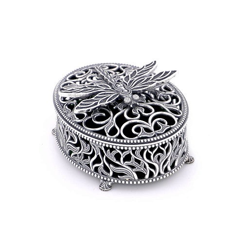 Элегантность — это искусство жизни, вдохновленное модой, грацией и изысканностью… Храните свои маленькие сокровища в этой красивой шкатулке для драгоценностей, выполненной ювелирами Приволжского ювелирного завода «Красная Пресня» в стилистике модерна. Будь то жемчужное ожерелье, колечко, сережки или другие украшения — в объятиях мягкого бархата они прекрасно будут здесь храниться. И каким бы ни был их стиль, красавицам понравится вынимать свои красивые украшения из этой красивой шкатулки! Шкатулка для драгоценностей выполнена из серебра и темно-зеленого бархата — символа роскоши и высокого стиля. Она великолепно украшена стилизованным растительным орнаментом, а крышку венчает выполненная из серебра стрекоза, которую наши предки принимали за волшебное существо, олицетворяющее искусство изменения и трансформации. Но и это еще не все. Шкатулка послужит вам не только маленьким тайничком для сокровищ, но и замечательным элементом декора. Она сама способна украсить интерьер, который любит аутентичные предметы. Винтажный предмет со следами времени, например, легким чернением, которое ей так к лицу… Шкатулка продается в фирменном футляре.