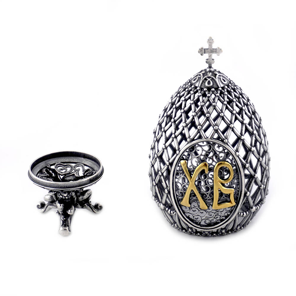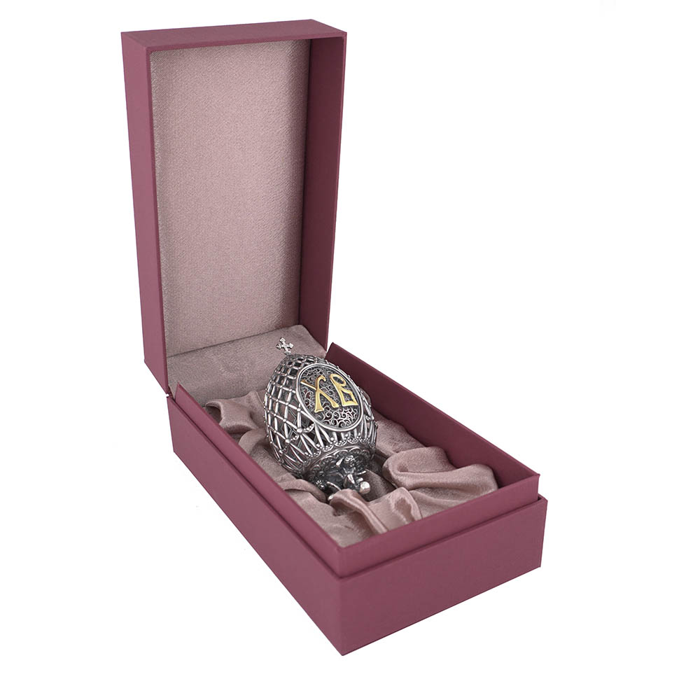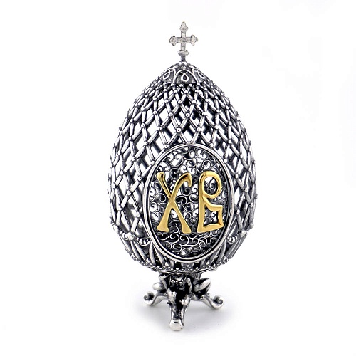 Сувенир "Пасхальное яйцо" изготовлен из серебра 925 пробы с оксидированием (чернением), имеет элементы выборочного золочения. Данный сувенир состоит из двух частей и может стать прекрасным пасхальным подарком.