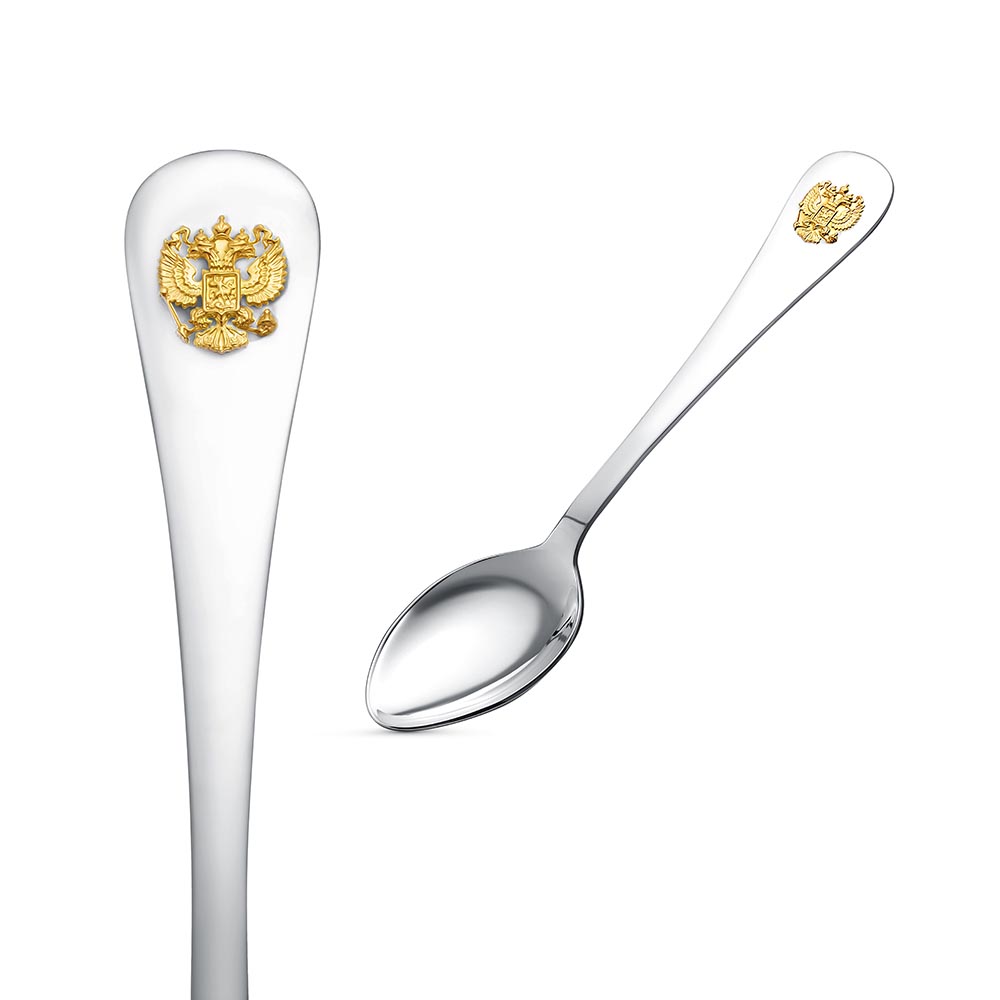 Аккуратная и удобная ложка выполнена из серебра 925°. На черенке ложки расположен позолоченный двуглавый орел, который символизирует единство и суверенитет России.