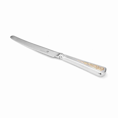 Идеально гладкий нож с отполированной поверхностью и плавно закругленным лаконичным лезвием. Ручка ножа выполнена из серебра 925°и декорирована позолоченным узором. Лезвие изготовлено из высокопрочной нержавеющей стали.