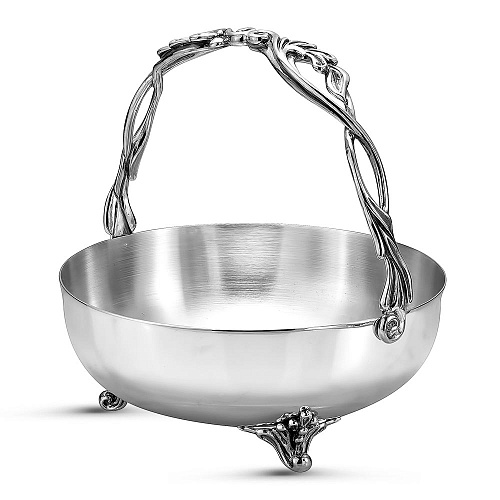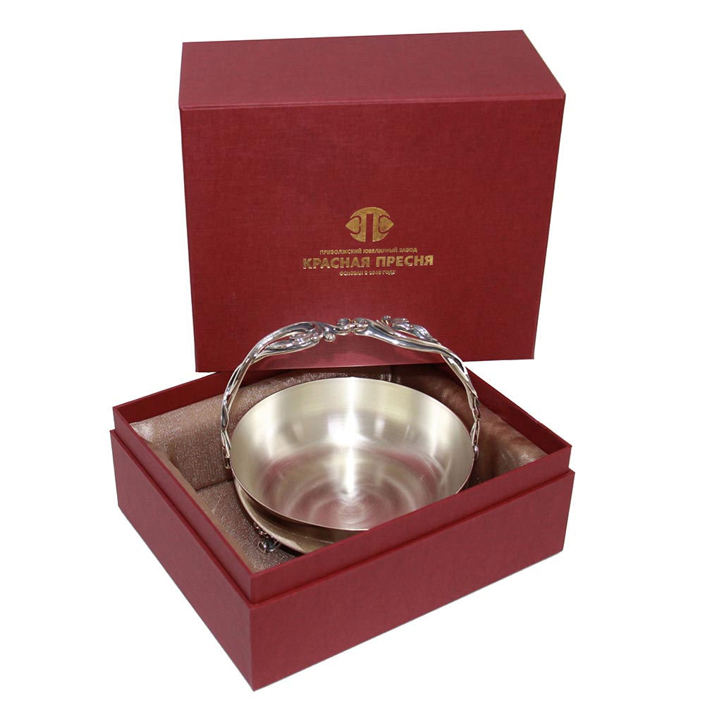 Идеально гладкая конфетница выполнена из серебра 925°. Она имеет простой лаконичный дизайн, с красивой ручкой выполненной в виде виноградной лозы. Поверхность ее отполирована вручную, что придает изделию невероятный блеск. Конфетница идеально дополнит сервировку вашего стола при семейном чаепитии.