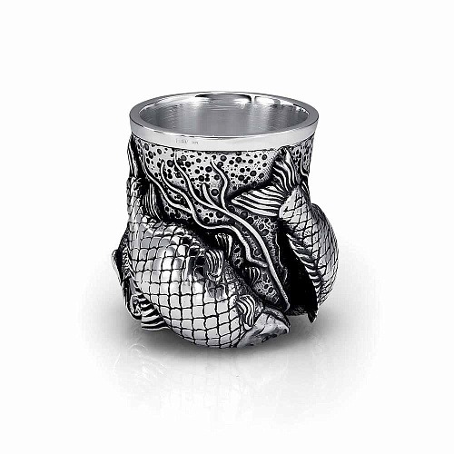 Серебряная стопка – значимый представитель подарочного столового серебра, воплощающий непревзойденный шик и практичность. Стопка выполнена из серебра 925° с элементами оксидирования на внешней стороне, на которой изображены морские рыбки.