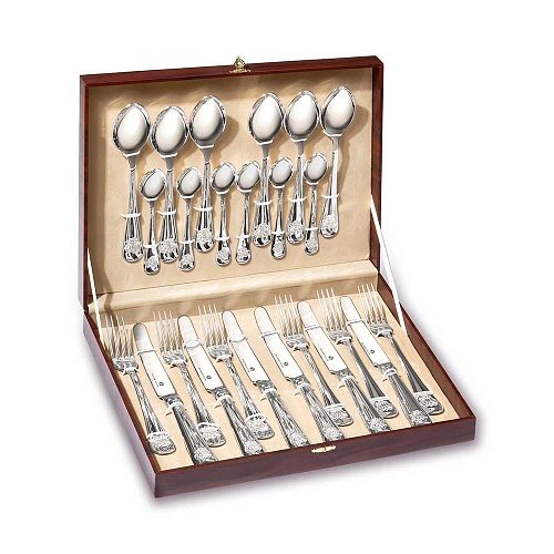 Столовый набор выполнен из благородного металла 925° на 6 персон и включает в себя: вилки, ножи, столовые и чайные ложки.